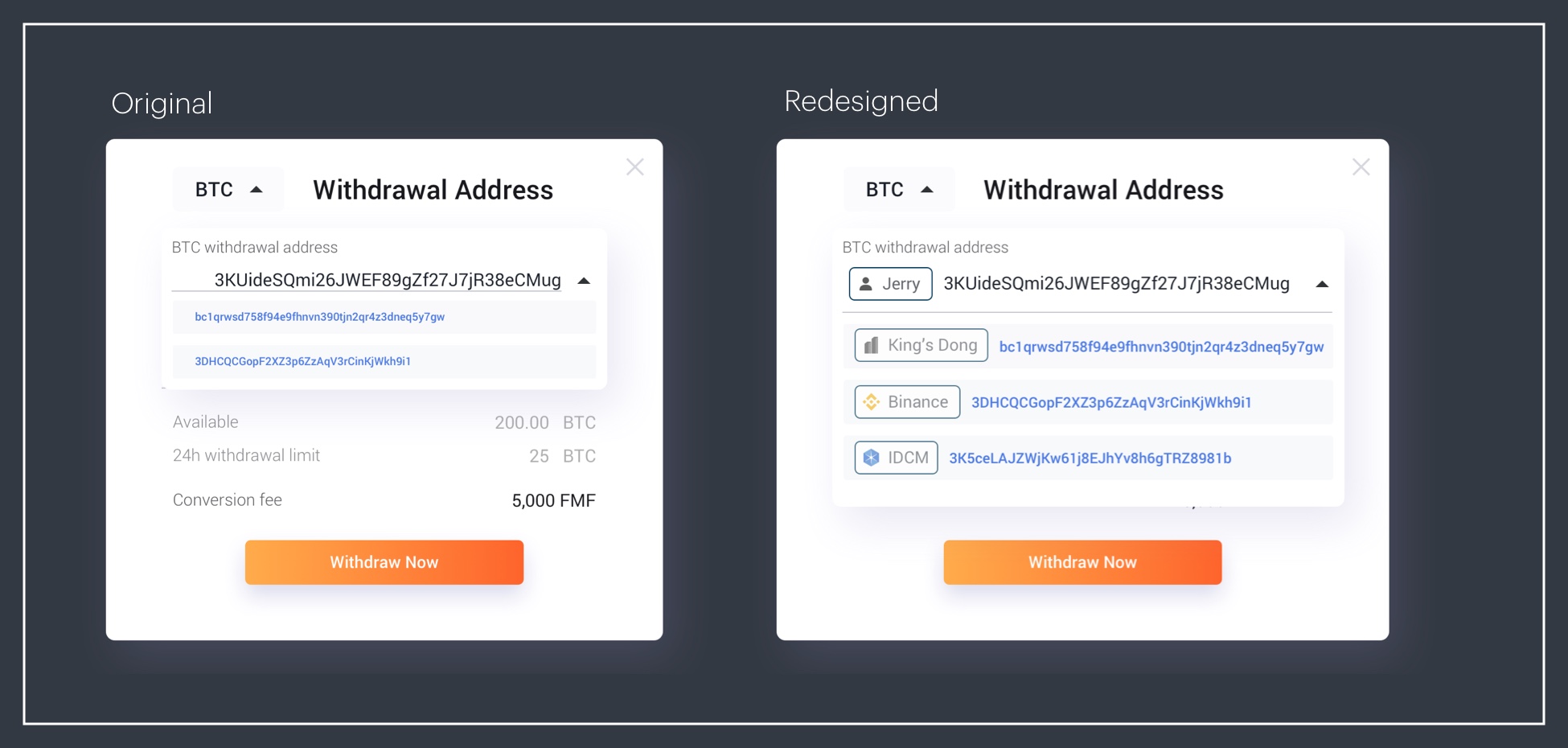 Symbolization Reduces Information OverloadBlockchain is built on code, most of the information is redundant with a decision. The product should translate this information for reducing users’ burden of recognition. However, the Hash data is still irreplaceable, because it provides trust.