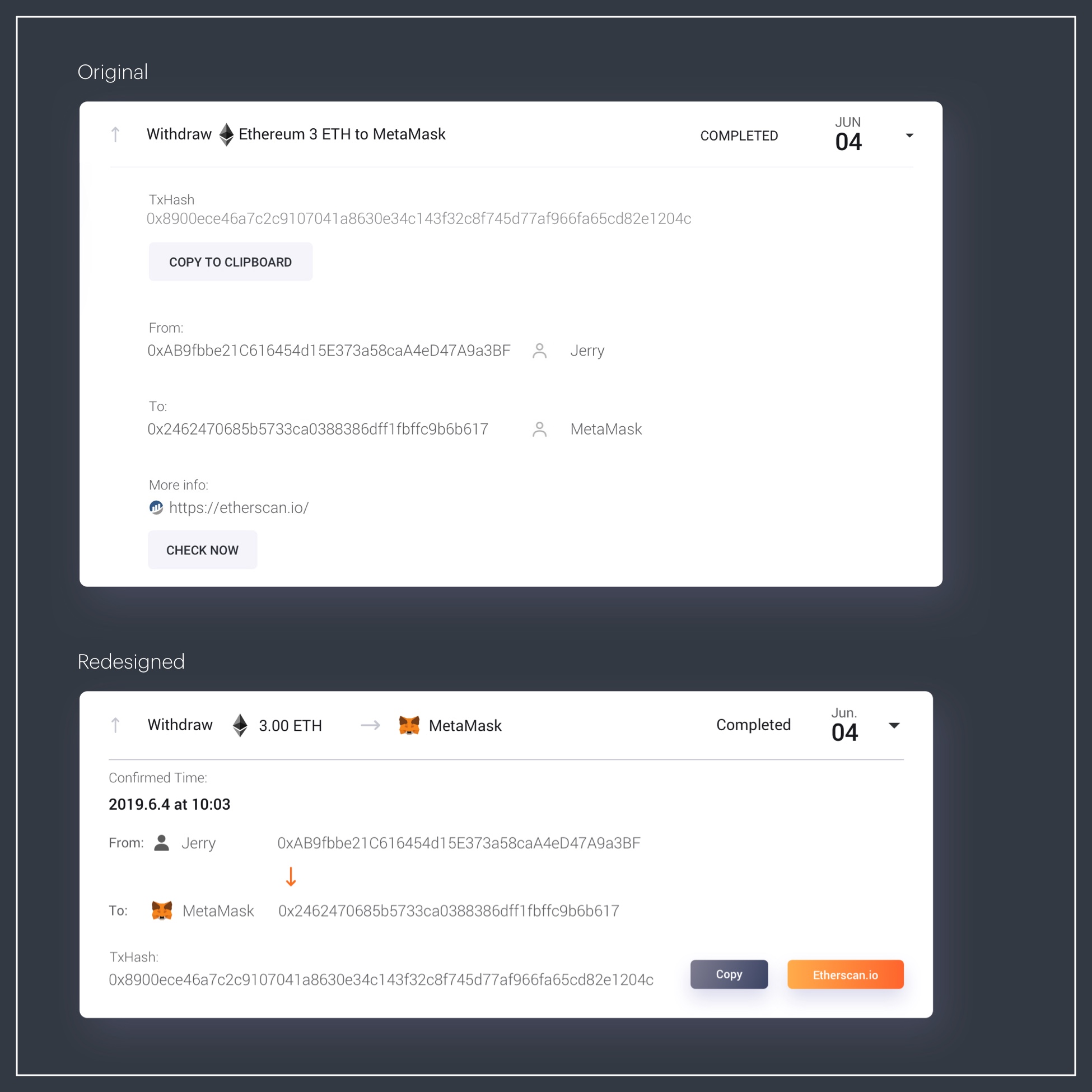 Crypto management is all about trust, so every design has to be based on trust, transparency, and data disclosure. Blockchain application is still far from people’s experience, and a part of the behavior pattern is different from the reality. As a designer, that’s an opportunity to “define” instead of “follow” the previous design like other existing patterns.